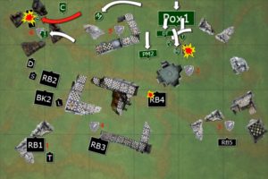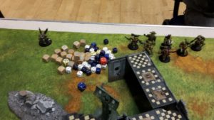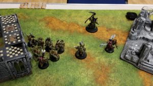 On turn 1, it had to move onto the board, so that was unavoidable. After my first turn, I was able to lock it in combat, forcing him to fall back and not fire on turn 2. After that, I think he was just moving to try and get away from my assaults. It might have been better to sit in place and hope to hit, especially as the additional -1 from the Darkshroud made it even harder for him.