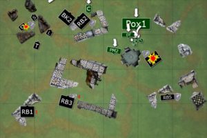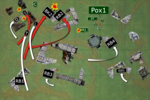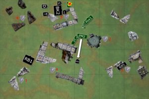 On the right flank, the Plague Marines advanced to get into range of objective 6. Mortarion moved up on the Ravenwing forces on the right, while the Death Guard forces on the left continued to move up towards the central line of the battlefield. The Blightbringer went after the retreating Black Knights.