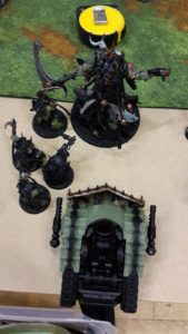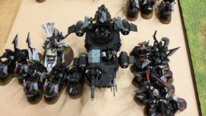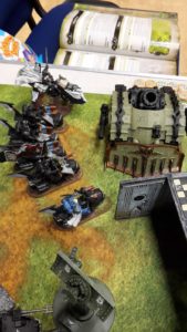 In the shooting phase, the Black Knights fired on the Crawler, only managing a single wound that was saved by a disgustingly resilient save. Sammael added his firepower, wounding twice, but once more the Crawler proved resilient. The Darkshroud and Talonmaster added their firepower, only managing to do a single wound between them.