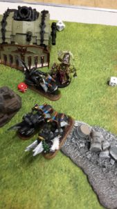 The Knights attacked Mortarion, wounding him three times (two of which were 6’s to wound, doing D3 damage each). The Primarch failed two wounds and took 4 damage, leaving him on a single wound. The Ravenwing Bikers attacked, managing to do two wounds. He failed both saves and Mortarion perished, taking one Biker with him as he fell.