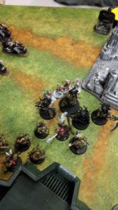 The Black Knights attacked the Putrifier, wounding him three times and killing him. He exploded in a shower of pus, dealing one mortal wound to the Black Knights.