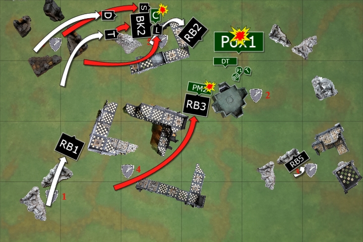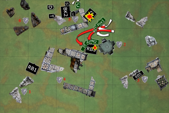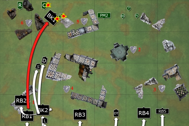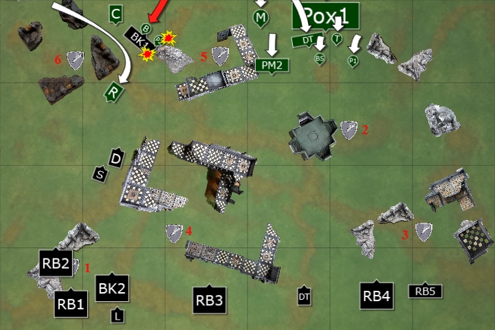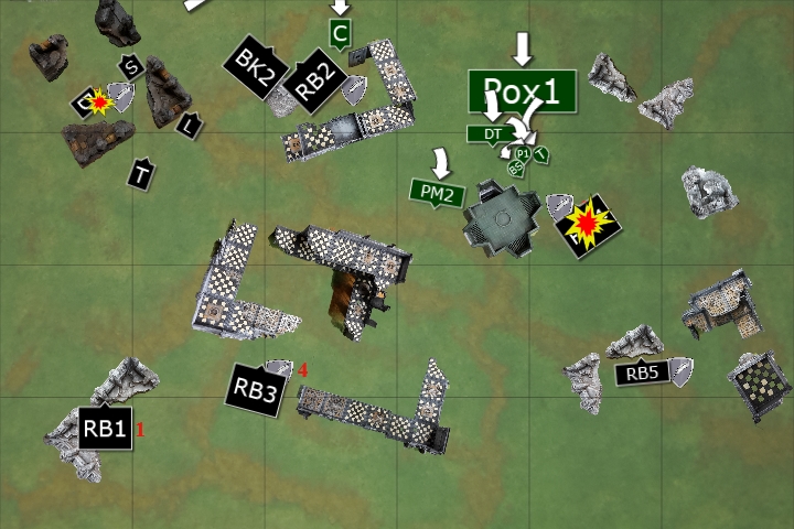 On the left flank, the Black Knights fell back from combat. I wanted them to survive the turn and score me Behind Enemy Lines. The rest of the forces moved up to engage the Rhino. The Talon Master arrived, moving on the left flank to support the main units.