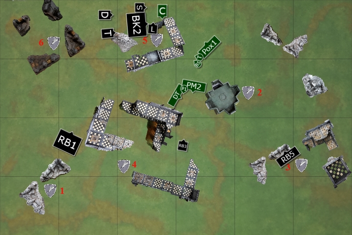 On the right flank, the Plague Marines advanced to get into range of objective 6. Mortarion moved up on the Ravenwing forces on the right, while the Death Guard forces on the left continued to move up towards the central line of the battlefield. The Blightbringer went after the retreating Black Knights.