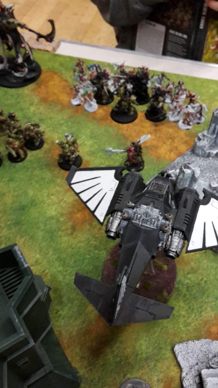 In the shooting phase, the Black Knights fired on the Plagueburst Crawler, but failed to harm it. Sammael fired at it, doing a single wound with his Plasma Cannon. The Talon Master fired, doing another wound, while the Darkshroud was able to finish it off.