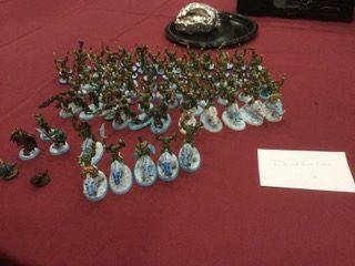 Chad Graham’s Order army won Best Hobbyist (to the left). It has an amazing Alarielle model with several Frost Phoenixes painted in stunning blues. Mike Scaletti with a tenth place standing and a stunning Khorne monster and Judger list took Renaissance Man (to the right).