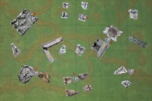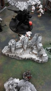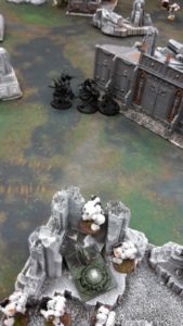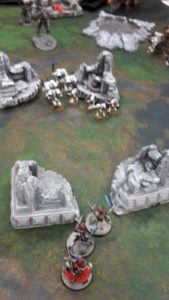 Stu set up his units pretty far forward in reply. The two Vanguard units went in the ruins in his deployment zone, with the bulk of his forces going on his left flank. The Dunestrider and Tech Priest Dominus held the right flank.