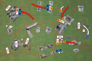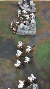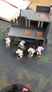 In the White Scars deployment zone, the Infiltrators fired on the Tactical Squad in the ruins, killing two of them. The other squad of Infiltrators fired at the Scouts in the ruins, killing one.