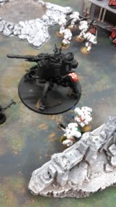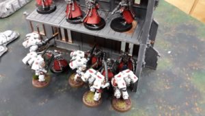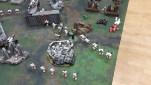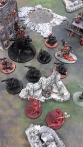 I used the Scouts, Tactical Squads and Assault Marines to set up my board control elements early. In my last game, I put the Scouts too far forwards and they were easily assaulted and killed in turn 1. In this game, I still set them up forward, but made sure they were out of rapid fire range of most of the Mechanicus forces. It was actually better for me to try and get up close and tie up the high firepower units early on.