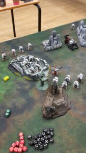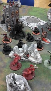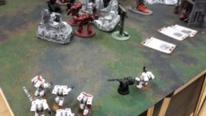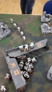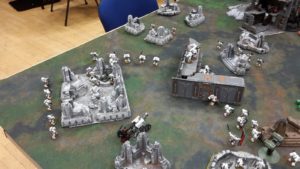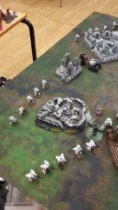 I think my plan worked pretty well. I was able to use my deployment to control pretty much half the board. This forced Stu to delay deploying his Infiltrators until he could deal with the Scouts and get them closer to my backline.