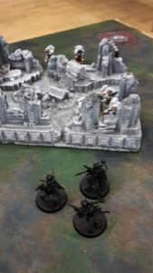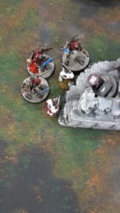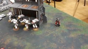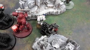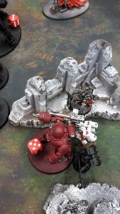 The Datasmith fired on the Vanguard Veterans in the ruins with the Librarian. He needed to kill off the last Veteran so that he could target the Biker Captain with his other shooting. He managed to wound the Veteran, but I made my 6+ armour save!