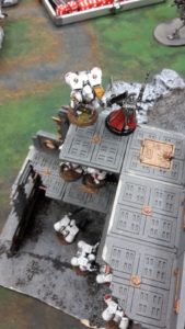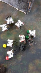 The backfield White Scars then turned their attention on the Mechanicus forces. The Heavy Bolter Devastators fired at the Destroyers, killing one more of the squad. The Tactical Squad fired its Missile Launcher at the Robot, but failed to hit. The second Devastator Squad fired their missiles at the Castellan Robot, destroying it. Stu used a command point re-roll to try and make it explode, but failed in his attempt.