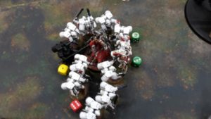 The Dunecrawler split its fire between the Scouts and central Assault Squad, killing only one of the Assault Marines. The Castellan Robots split their fire between the two Scout units closest to them, wounding each unit 9 times and wiping them out.