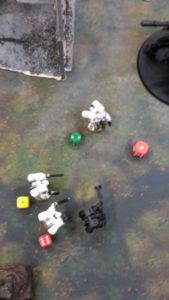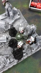 The Assault Squads attacked the Dominus, wounding him 8 times with their combined attacks, but Stu made all his armour saves. The Sergeant struck with his Power Fist, wounding 3 times, one of which got past his armour save. The attack only did a single wound, leaving the Dominus on one wound. The Lieutenant then struck and was able to slay the Tech Priest.
