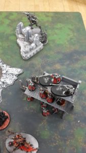 The Biker Captain struck at the Destroyers, hitting four times but only managing a single wound, killing one of the Mechanicus Destroyers.