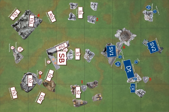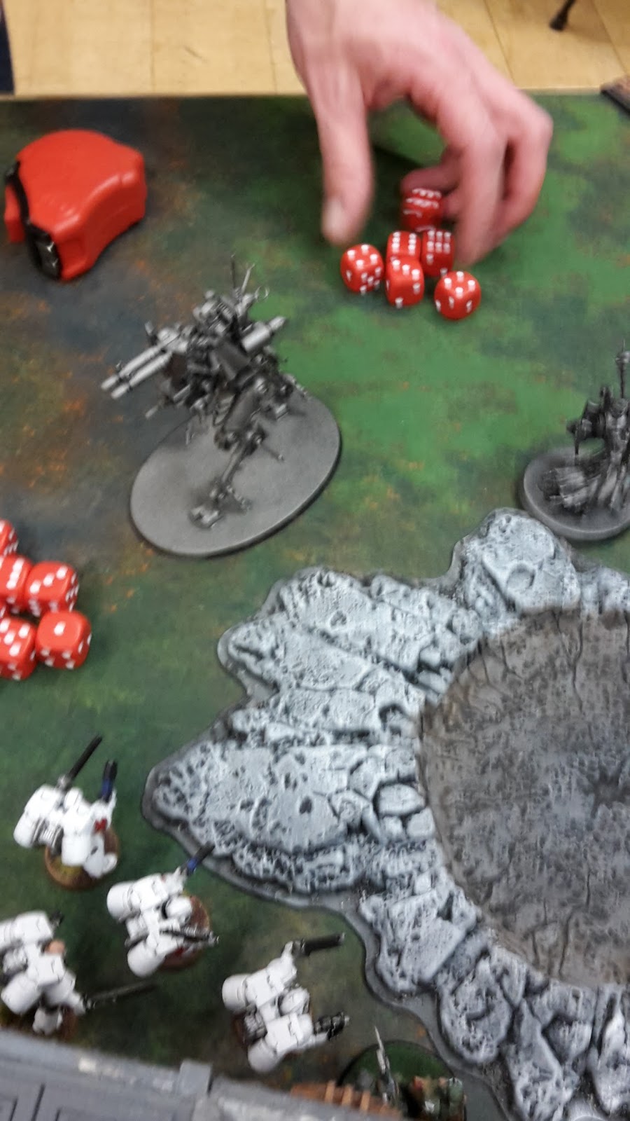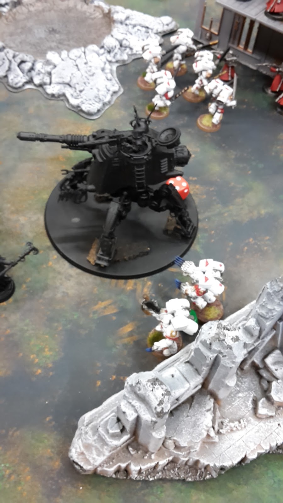The Castellan Robots, Dunecrawler and Destroyers fell back from combat. The Dunestrider moved up on the Scouts in the ruins.