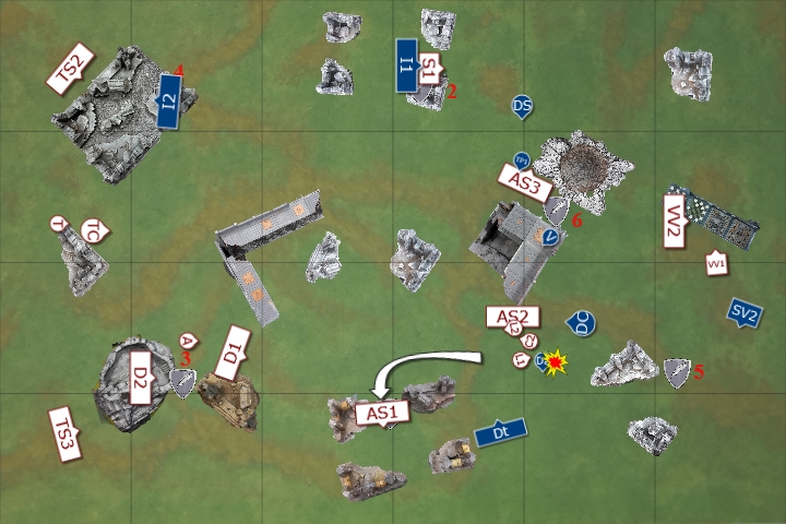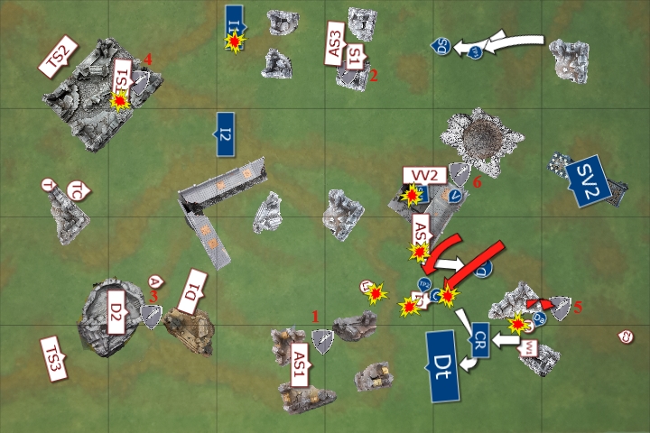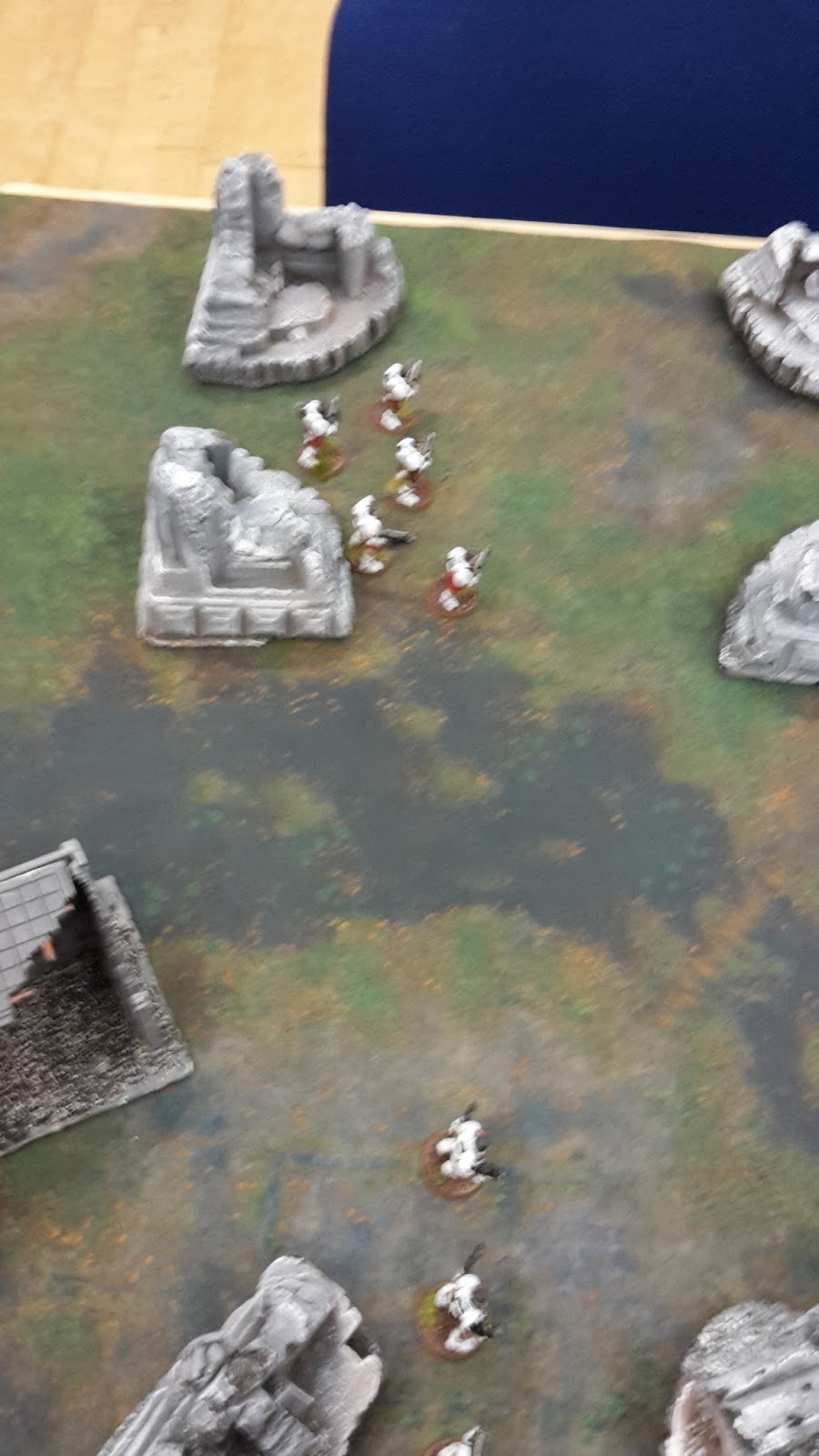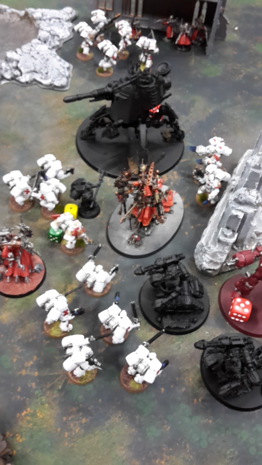 The Mechanicus forces then attacked back. The Destroyers put a wound on the Captain, while the Castellan Robots killed one of the Vanguard Veterans. In the central ruins, the Skitarri Vanguard were unable to cause any damage to the White Scars units.