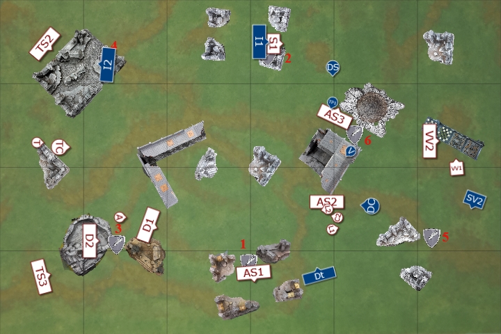 On the right flank, the Biker Captain and Lieutenant moved up on the Mechanicus Destroyers, while the nearby Assault Squad advanced into the ruins in front of them. In the centre of the battlefield, the Assault Squad moved up towards the ruins. On the left flank, the Scouts and Assault Marines moved up on the objective, the Assault Squad advancing into range.