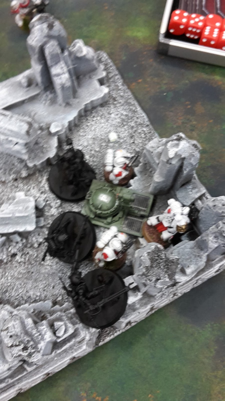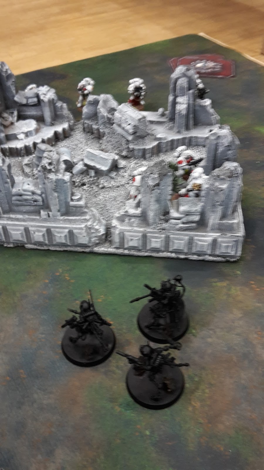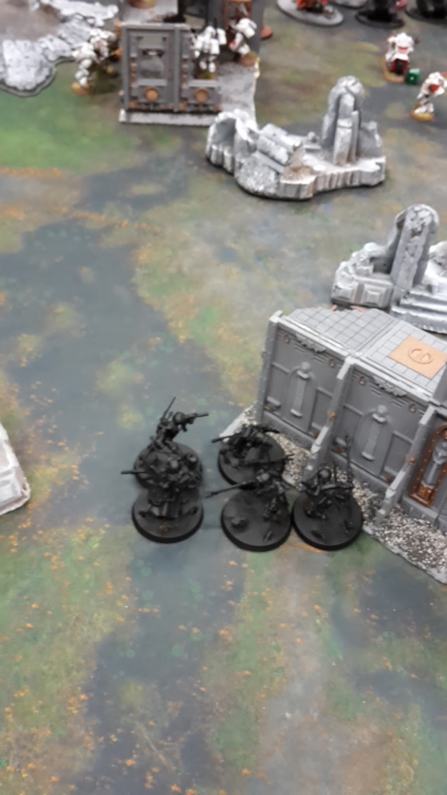 In the White Scars deployment zone, the Infiltrators fired on the Tactical Squad in the ruins, killing two of them. The other squad of Infiltrators fired at the Scouts in the ruins, killing one.