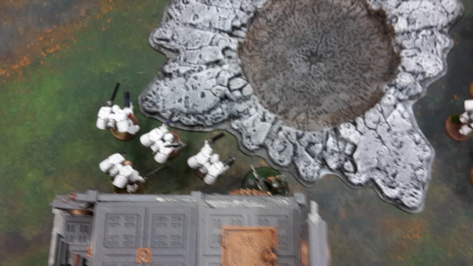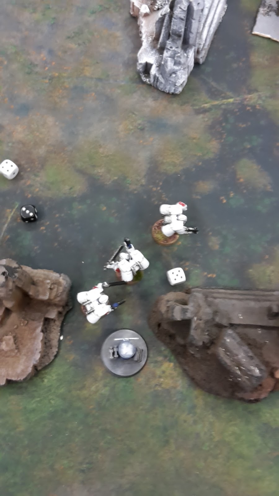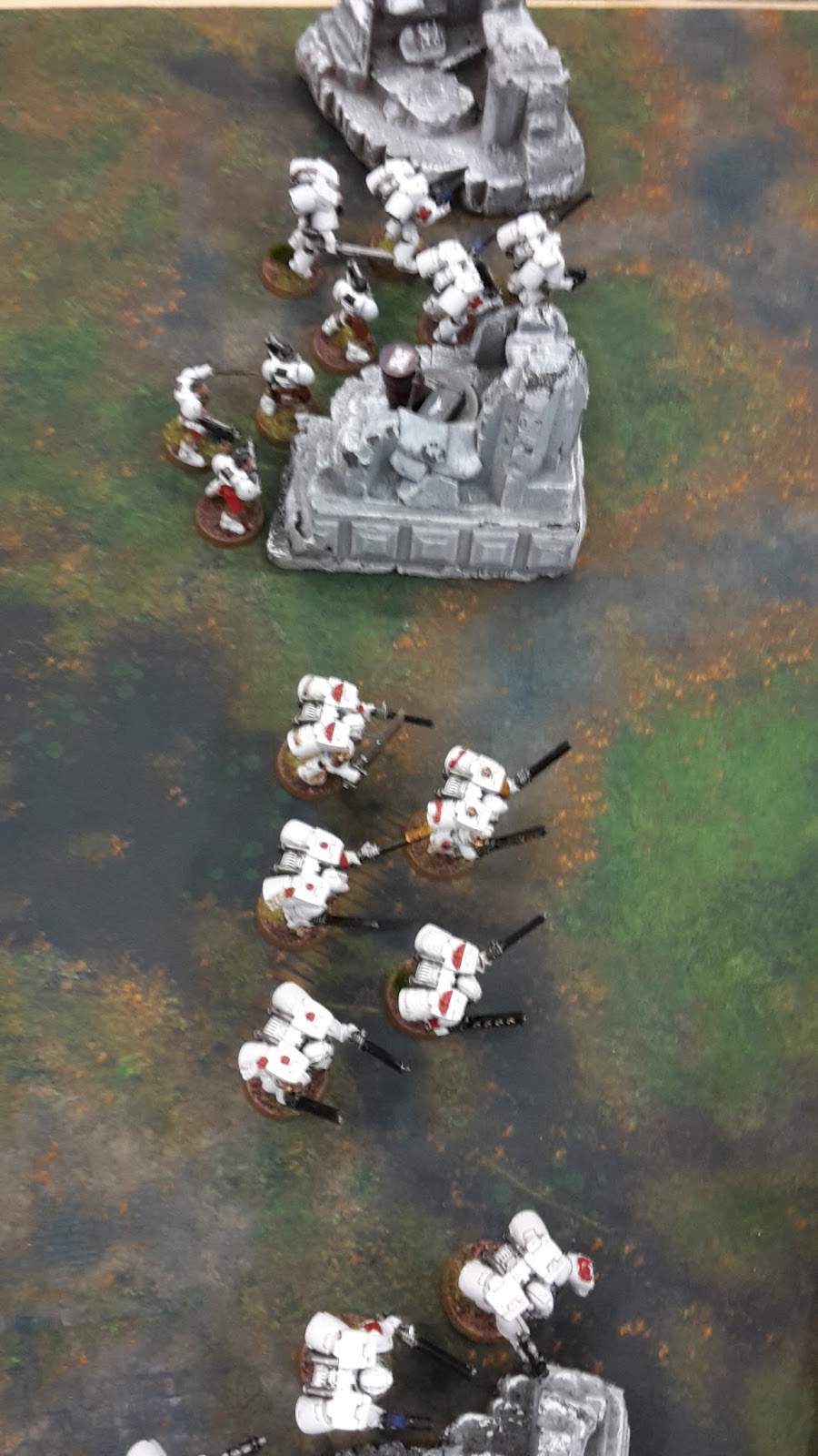 In the White Scars deployment zone, the Infiltrators fired on the Tactical Squad in the ruins, killing two of them. The other squad of Infiltrators fired at the Scouts in the ruins, killing one.