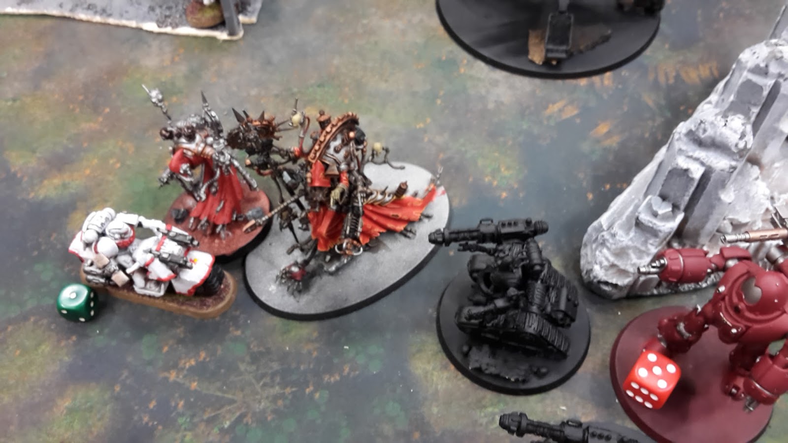 In the charge phase, the Vanguard Veterans assaulted the Skitarri Vanguard, one of the White Scars perishing to the overwatch fire. The White Scars on the right flank all charged the Tech Priest Dominus.