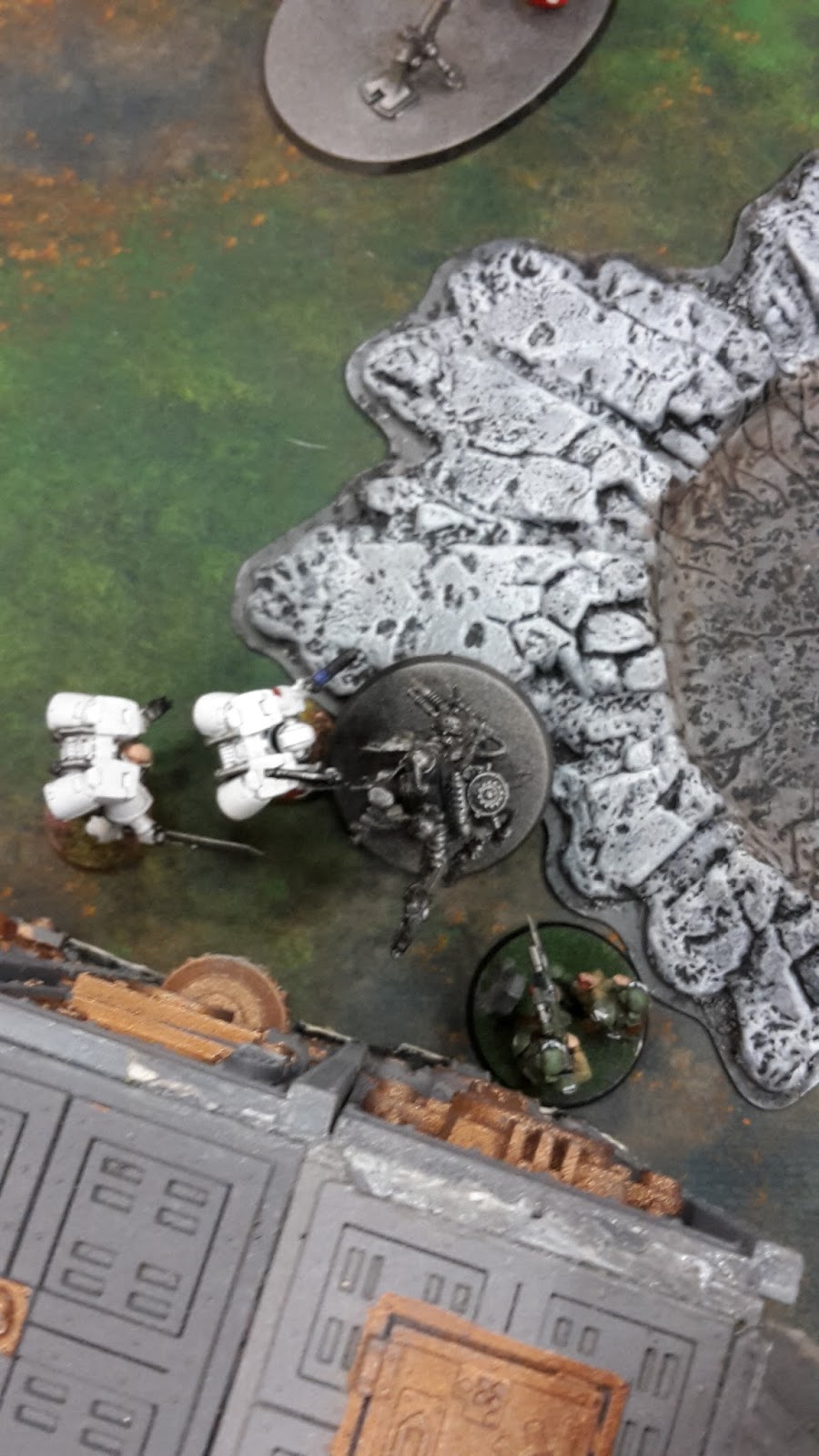 The Datasmith fired on the Vanguard Veterans in the ruins with the Librarian. He needed to kill off the last Veteran so that he could target the Biker Captain with his other shooting. He managed to wound the Veteran, but I made my 6+ armour save!