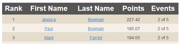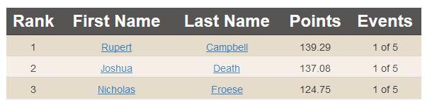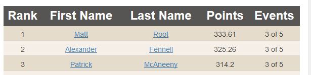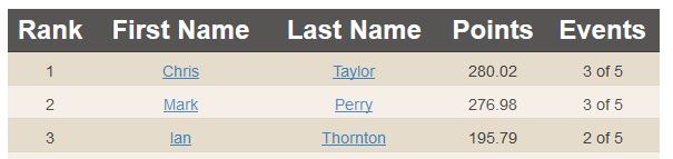 The South has Chris Taylor in the lead by a hair with 280.02 points to Mark Perry’s 276.98 points.
