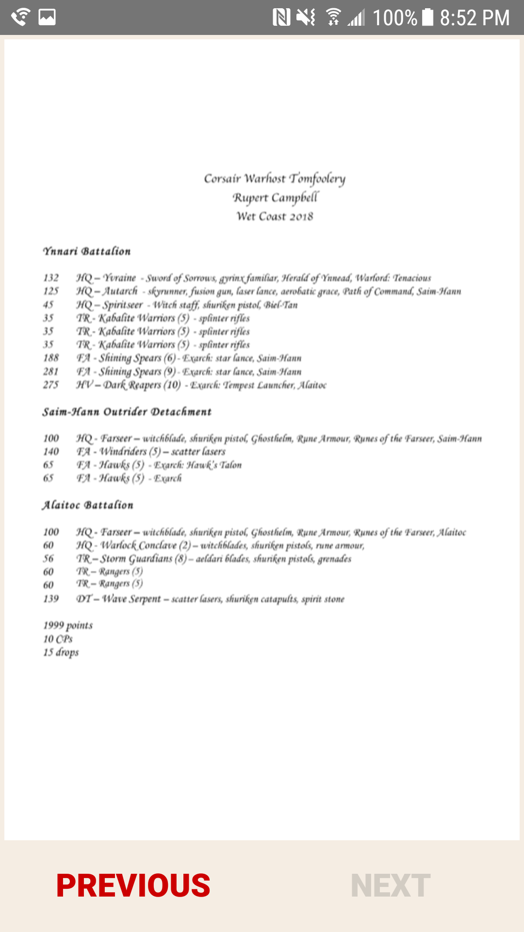 With a Ynnari Battalion, Saim-Hann Outrider Detachment, and an Alaitoc Battalion Rupert’s list is a fast and nasty list. Not too spam heavy and not too reaper heavy with a good mix of quality units and Psychic prowess it isn’t difficult to see the list doing well with a capable player behind it. 10 CPs and only 15 Drops is pretty good as well and you can’t really go wrong taking Yvraine right now in 40k.