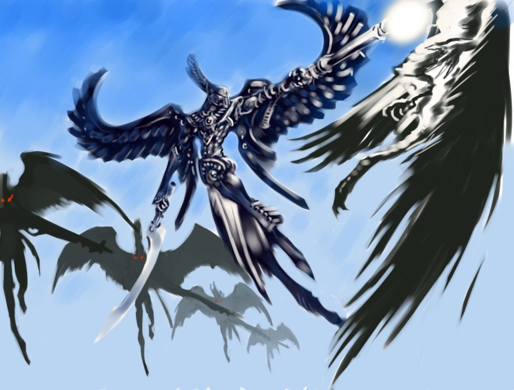 Baharroth, translated as “the Cry of the Wind,” is the youngest and most active of the Phoenix Lords; his eager sense of justice moves him to seek out the forces of evil and strike them down wherever he is able, and though he is countless millennia old, his sense of youthful purpose and determination remain with him. Eldar mythology has him as one of the Phoenix Lords who will meet his final death during Rhana Dandra, the final battle when Chaos consumes the universe and the last of the Eldar race is extinguished.