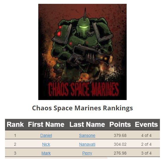 Heh. Daniel Sansone was in first place for Chaos Marines that whole time; he won our season opener tournament here but we had to report manually, so it didn’t reflect in his records until right before this article published. 😛