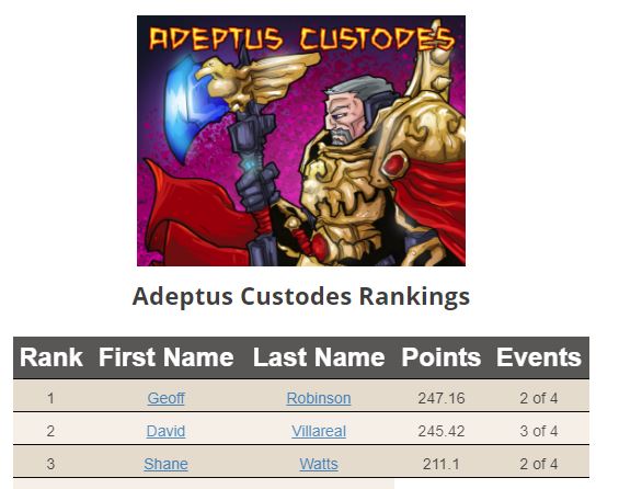 Another big faction shift came from the Custodes Faction. If you remember I mentioned that I thought the new golden boys of 40k would be a faction to watch in the coming months, and I still believe that. I also stated that I thought the Custodes role in the competitive 40k scene would probably be as a piece to a more diverse list and the current jump of Geoff, incontrol, Robinson into First place in that faction comes from his 9th place Adepticon showing with a list that is Custodes Primary but with some complimentary Imperial pieces.