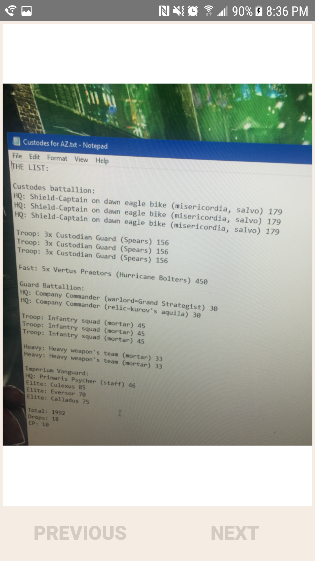 Vertus Praetors and Shield-Captains on Dawn Eagle’s are where it’s at with Custodes at the moment, and Geoff proved that. In a list with 10CPs and a Guard Battalion that served as a rechargeable CP battery, I am sure he could use Stratagems for days in his matches. For those not familiar with the Astra Militarum CP battery allow me to elucidate. Imperial armies, like Grey Knights and Custodes, that require massive amounts of Command Points in order to use their Stratagems to effectively win games; also, generally speaking, cannot gain enough CPs on their own from detachments of the pure faction persuasion. The Astra Militarum Battalion is the perfect way to gain 3 Command Points on the cheap with the ability to regain or gain, Command Points during the game. Kurov’s Aquila is a generic AM relic that allows you to gain a CP on a roll of 5+ anytime your opponent uses a Stratagem. The Grand Strategist Warlord Trait lets you roll a d6 anytime you use a CP, on a 5+ you are immediately refunded that CP. With Kurov’s Aquila on his Warlord with Grand Strategist Geoff was probably gaining and refunding CPs at the rate required to effectively let his Custodes do their work.