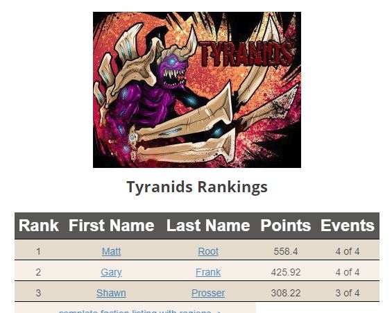 Matt’s list seems to have single-handedly pushed back Games Workshop’s March 40k FAQ! Good job Matt Root! His list has been discussed to death in many areas of the internet from Facebook to the forbidden zones of DakkaDakka and Reddit. So I won’t beat a dead horse here any further, but suffice it to say that list is brutal and put into the hands of one of the preeminent Warhammer 40k players in the world it is frighteningly effective. This has kept Matt firmly ensconced upon the top of the Tyranid Faction Leaderboard in the ITC with Gary Frank hot on his heels and Shawn Prosser still within striking distance.