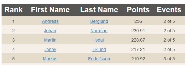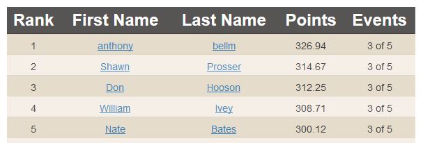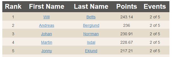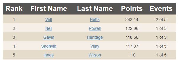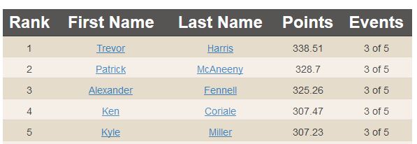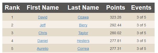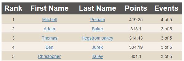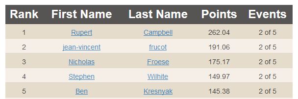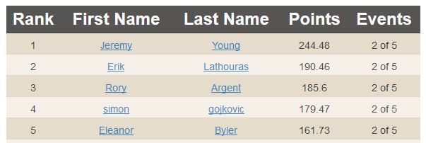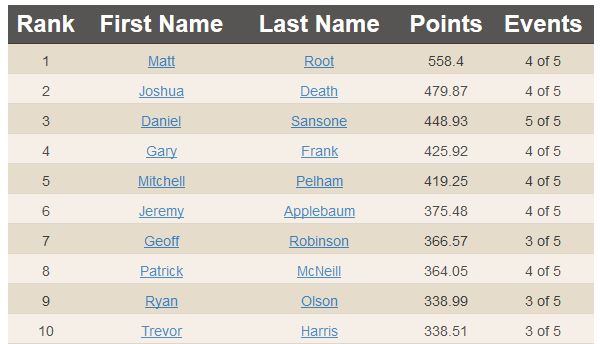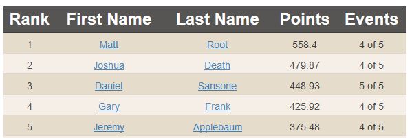 For the US leader-board, we have Matt Root edging out Josh Death for first because one of Josh’s scores is counted towards his placing in Canada, rather than the US.