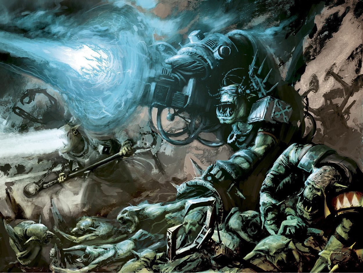 Each Ork that is “born” this way comes out with a particular set of skills. The mechanically minded Orks are called “Mekboyz” and they create all the weapons, wargear, and machinery. Ork “technology” by all accounts shouldn’t work – and indeed it often doesn’t work – but for what they lack in technical finesse they seem to make up for in belief. An Ork weapon will not operate in the hand of a human, because the weapon in some way draws on the power of the Ork who believes he can kill with it. This energy permeates a warband, and it is what pushes the primitive Orks from feral and wild into a spacefaring species. Psychic Orks called “Weirdboyz” channel the warlike energy of their brethren into powerful spells (provided their ‘eads don’t explode in the process). The basic boy may prefer different modes of combat, such as flying with a rocket strapped to its back (which also inspires a rare form of organized militancy, mocked by their fellow boyz for marching in lines and doing drills), or looting big gunz off of their defeated foes, or hunting tanks or other armor with rokkitz. Ork currency is counted in “teef” which fall out of their mouths in droves (often due to brawling with other Orks). The bigger the toof, the more cool bitz and gubbinz you can buy with it. The teef of powerful enemies always fetch the highest price, especially since Ork teef rarely stay whole long enough to maintain anything resembling a functional economy after they fall out, as if engineered that way to prevent an Ork from caring about money.