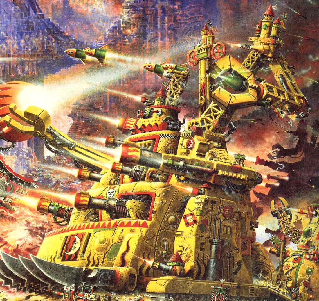 Each Ork seems to know how to do everything its role requires with no training – they are simply pre-loaded with all the knowledge they need. They all worship their twin gods, Gork and Mork. Gork, is brutal, but kunnin’ while Mork is kunnin, but brutal. Probably? When Orks are gearing up for war, they build idols to their gods. These are the super-heavy titan vehicles known as Gargants and Stompas, and they inspire Orks to greater war-worship. Warship? It’s simply complicated.
