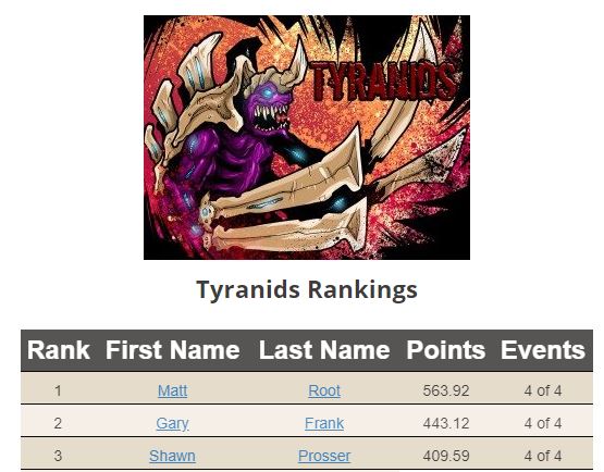 This still does not put him into the top 3 of Tyranid players though as the top 3 Tyranid players are all in the top 7 of the ITC total. Nids are strong people. Matt Root, Gary Frank, and Shawn Prosser all still sit atop Tyranid Hivemind Mountain. The new FAQs did hurt the most popular Nid build to a certain extent. Flying Hive Tyrants took a small nerf. The power of Tyranids in my opinion though going forward is their shooting lists. I would look for a lot more double shooting Hive Guard thanks to the CP boos to taking Battalions. Nids can get 3 Battalions easily at 2k points and those Hive Guard units shooting twice do some serious work.