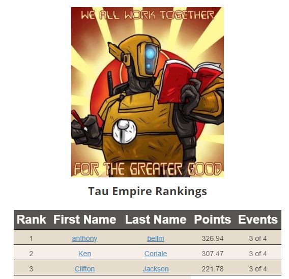 Anthony, Tony, Bellm still sits upon the throne of the Greater Good’s ITC standings with 326.94 points. Tau are still in what I consider the transition period of a new codex where players are trying to break old habits in terms of list construction and play style and adapt to the new, and much improved in this case, codex. The Tau community seems to be having some difficulty with this adjustment. I reached out to Tony to get his opinion on things in Tau land.