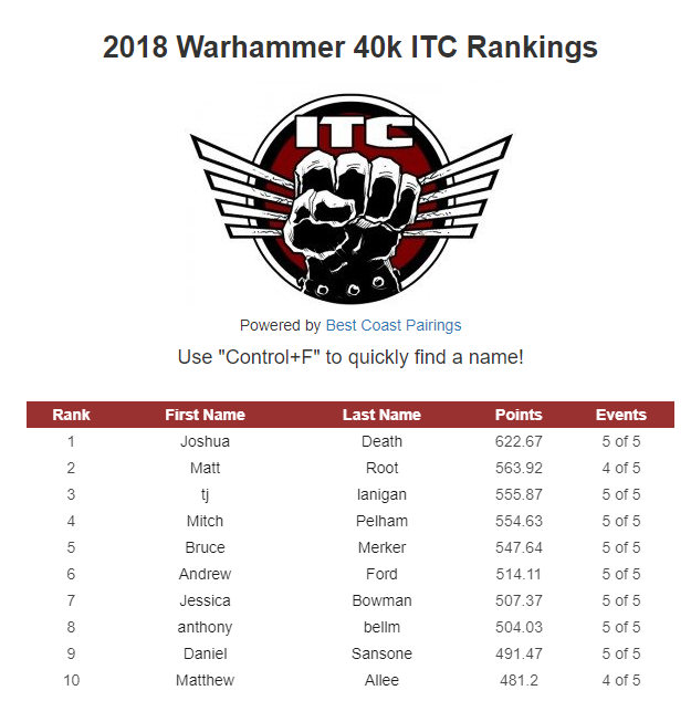 The top 20 of the West is a veritable who’s who of Warhammer 40k out in that region. With Mitch Pelham, Jessica Bowman, Richard Cozart, Ray Ahumada, Brandon Grant, and Jordan Stein all in the top 6 you would be hard-pressed to find someone from the West, who plays tournaments, that doesn’t know most, if not all, of those names. I expect quite the run at the number one spot in this region between those 6 as well as pretty much everyone in the top 20. Alexander Gonzalez seems to be back in the mix after playing a lot of Age of Sigmar last season, and you can never count out veteran players like Rich Kilton or Thomas Hegstrom Oakey.