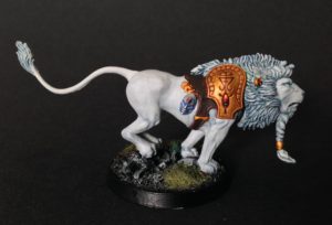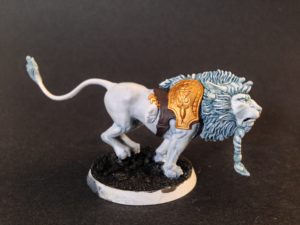 So time to do a bit of clean up and brighten the mane a bit. So just using Ulthuan Grey (the main color of the model) I pick out the locks of hair on the mane and tail, the strands in the beard, the raised areas on the face of the lion and bam! Thats it, you are all done painting the white. I treat this whole bit as a pseudo-highlighting stage and call it a day on the actual white of the model. When you start adding White Scar or even a blend of Ulthuan and White Scar it just takes the entire paint scheme into a starker shade of white that I do not want, nor do I think is necessary. You’ll see just how bright this model looks in the end, as the details are completed and in contrast to other models.