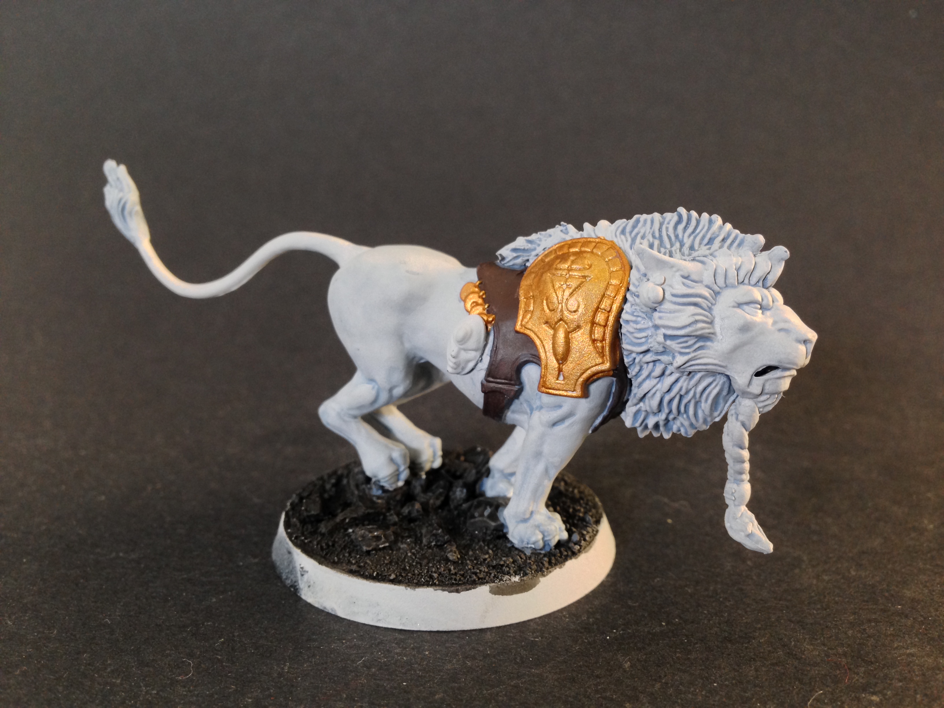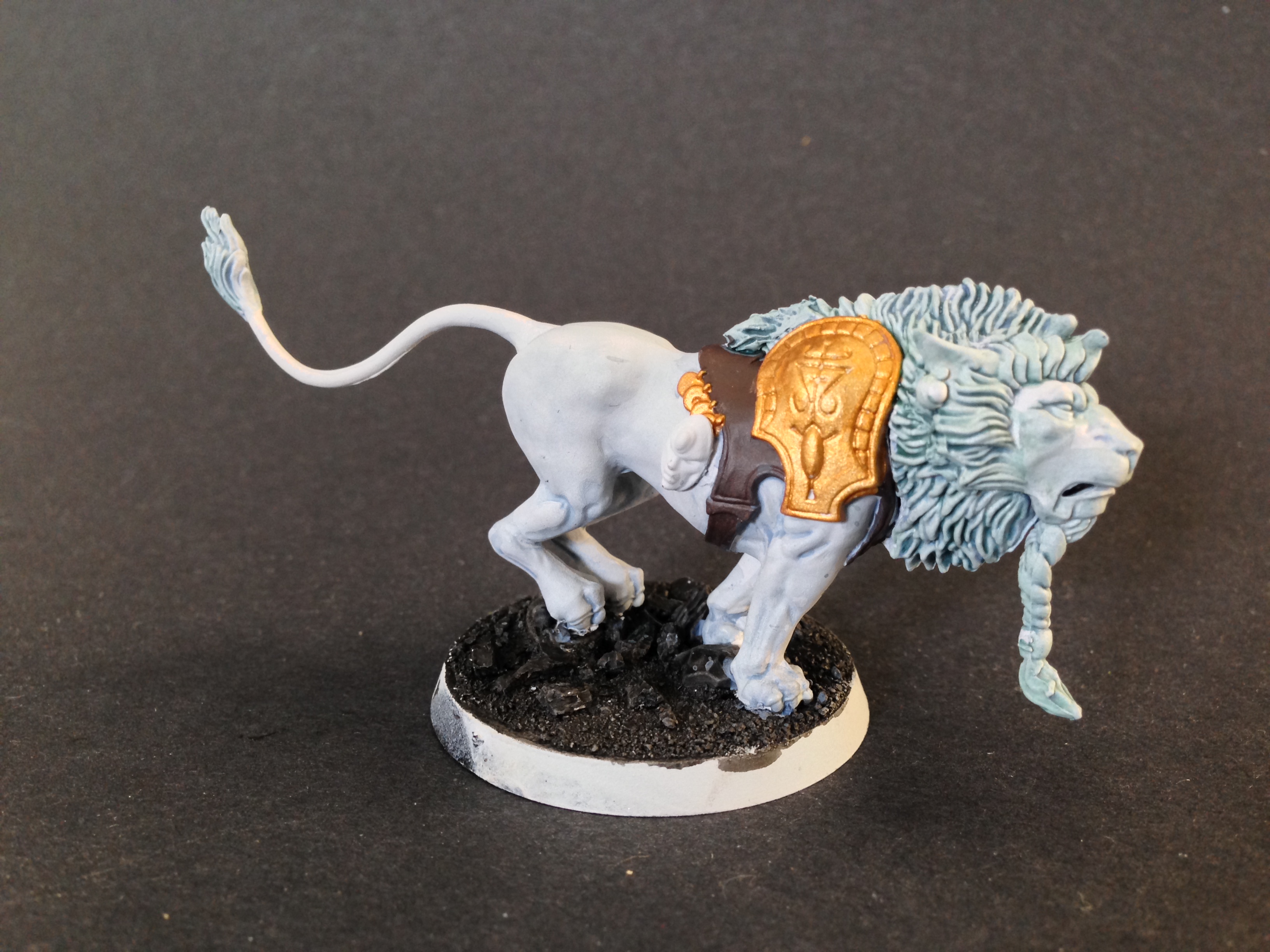 Now the model I’ll be showing is the matching lion to the one pictured above. So simply begin by priming the model Corax White.