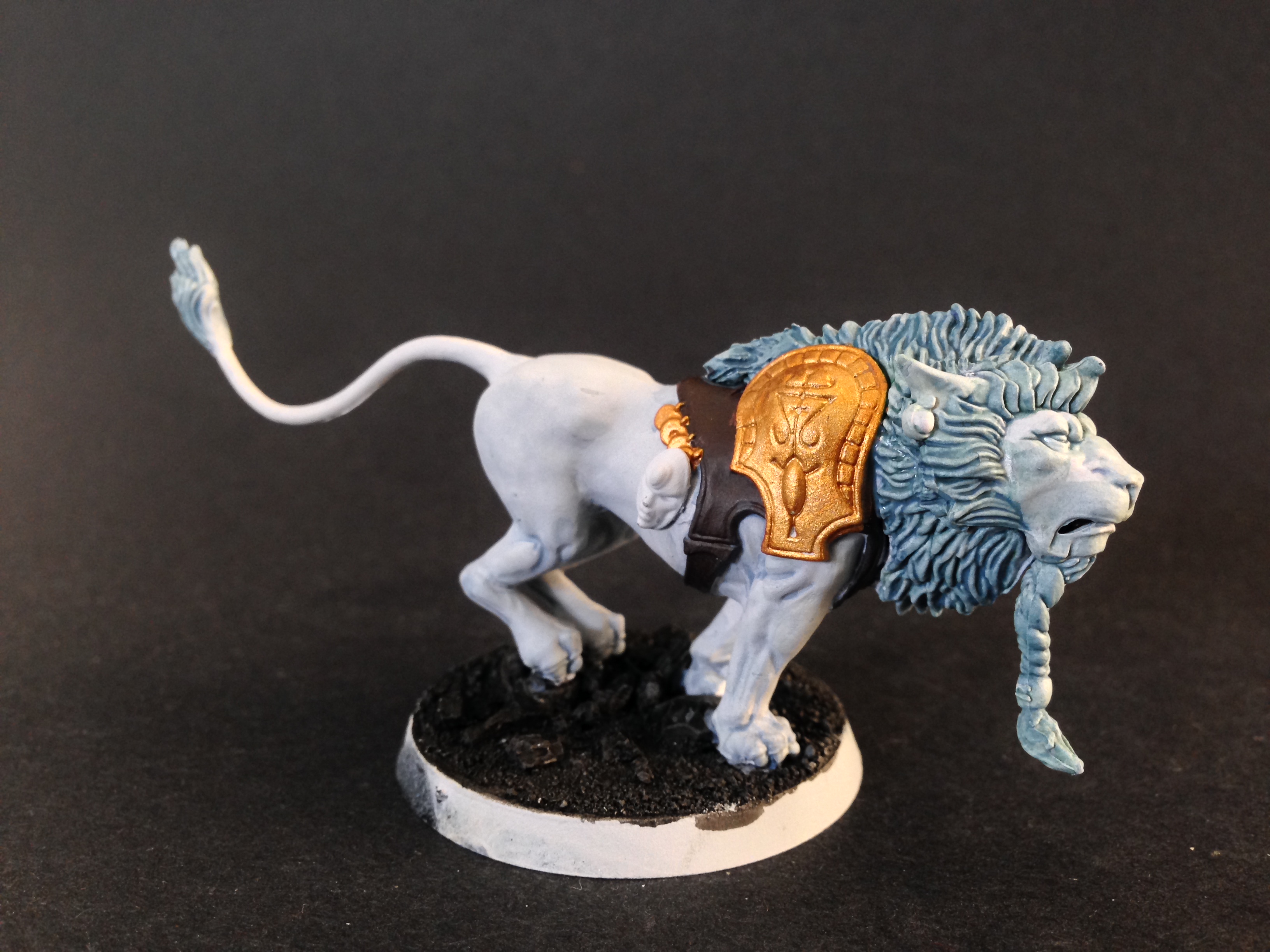 Enter Fenris Grey. Using just a bit of Fenris Grey and a healthy amount of Lahmian medium I make a light grey wash to apply all over the lion. It is very subtle but it makes for a cool ghostly ethereal vibe which works well for this warp-touched beast. I dont use any specific ratios, I just go on feel, adding a bit more grey for the mane areas, more Lahmian Medium on the body.