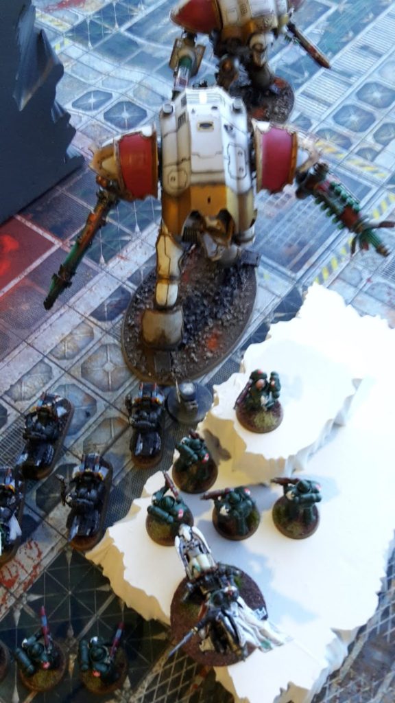 The Knight Styrix fired at the Bikers and Hellblasters, killing one Biker and one of the Primaris Marines. The slain Hellblaster fired back at the Atropos, but failed to do any damage once more.