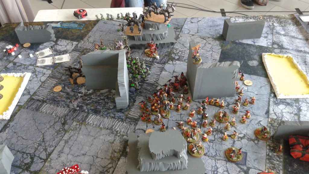 As I am sure people will comment on it, you can see in the pictures that the terrain was aesthetically pretty lacking but to be fair, it was very practical and adequately blocked LoS, etc. and was fine to play on. I do have to say though, it was a bit frustrating to fly all the way to London and play with–in some case–completely unpainted or even not fully built terrain. As for the missions, as I said on our podcast, 100% responsibility on me for not having practiced them but I must say, the Maelstrom, while fun, is not really the best choice for competitive play, IMO. In open and narrative play I think they are awesome missions, and a LOT of fun. But for truly competitive play they aren’t optimal for a number of reasons: