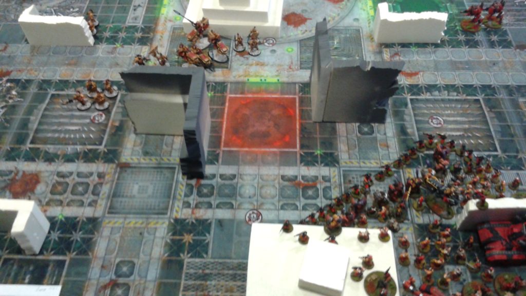 That pretty much eliminated my ability to win the game and then Mike had some really good luck making three 9″ or longer charges to stop me from advancing without chewing through a bunch of units, first. He also, of course, retreated his Warlord to safety once he saw how vulnerable he was. One of these big charges was a lucky 12″ distance which delivered 30 Plague Bearers from out of reserves into my infantry units whom they smashed with a boatload of buffed attacks. Had he failed that charge or even just rolled the minimum 9″, a massed Catachan charge into them would have likely been a wipe out the other way. But, that is not how the dice fell. That put him in a position to come in and totally gunk up my backfield, trapping my assault units between two Nurgly anvils where they’d likely stay for several turns before breaking out.