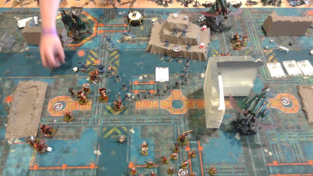 So, all of a sudden I was out of steam on the assault, lol. I only had a few units left that were viable to apply pressure and keep him pinned in. I had the Jetbike Captain take out a Hammerhead and jump on an objective and the Custodian Guard drop down on another to continue to increase my lead on the scoreboard, but both units got shot down over the next turn. Again, the Sniper Drones waxed the Captain fairly easily with the various buffs they had. When those two units got popped I had nothing left to apply pressure and was forced to switch to a defensive posture and hope my lead would hold.
