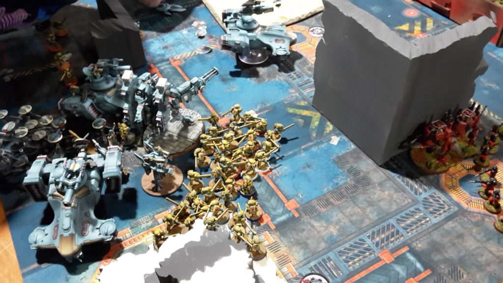 I knew this game would come down to if I could keep the T’au pinned in their deployment zone or not, and a lot of that was dependent on going first. As I got the +1 to go first, it was likely I would and as it turned out, I did. That was really important as it allowed me to take out a unit of Sniper Drones with all of my Artillery turn 1 and to get up-field and buff up the Conscripts and Bullgryn. On Andrew’s turn, he proceeded to light me up with his T’au doing a ton of damage but the fact that I could get the Conscripts up to a 4++ and the Bulgryn to a 2++ made them very difficult to hurt and I rolled hot on my Conscript saves, keeping them alive in the face of that withering firepower. That was two lucky breaks for me and put me in a very good position as I was covering most of the objectives on the table at this point.