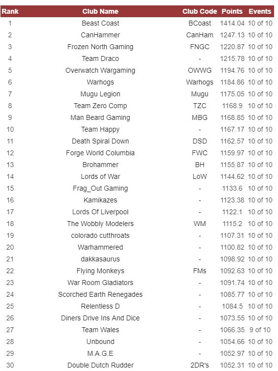Above is the current top 10 in the ITC for Warhammer 40k. Matt Root and Josh Death remain atop the pile. In the team rankings you’ll notice a newcomer to the top 30 that was the 4th place team last year, and second best team on the West Coast, Relentless D. Riding high on preeminent member Brandon Grants win at the Boise Cup the guys at Relentless D have begun their push to come in on the top teams and make sure their presence is felt.