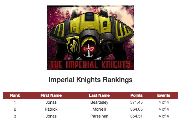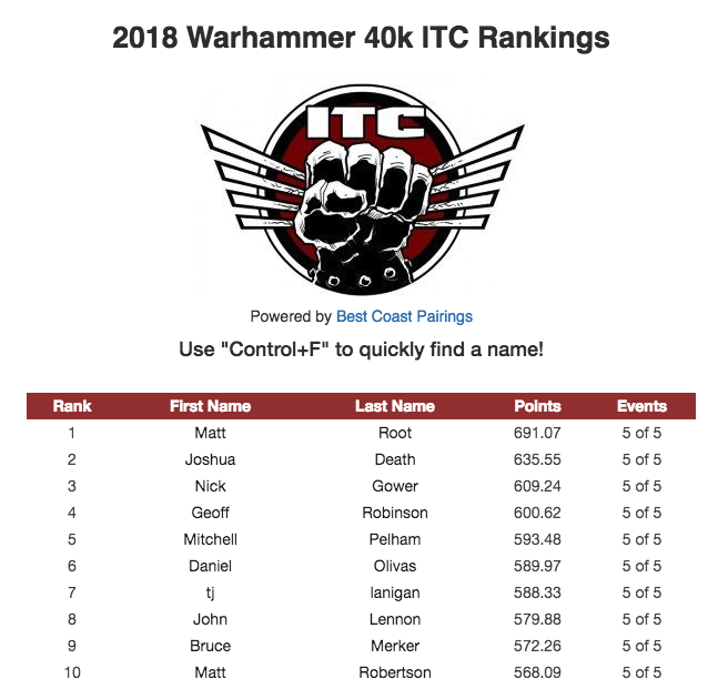 Back after a short break with a packed article! Last time I interviewed Josh Death, the second place player overall in the ITC, and this week I talked to the current number one and a former ITC champion Matt Root. In the last two weeks, a lot has gone on in the world of the ITC. With 4 Majors two weekends ago, including the ATC, and a GT a lot of movement was expected on a few of the leaderboards but not much materialized. The Necron leaderboard for example still has Chad Layton, Jessica Bowman, and Red Powell separated by only 13 points between all 3. Many of the races for faction have ratcheted up, but with a lot of the same names involved. I predicted the last few weeks that one of the more interesting things to watch will be Imperial Knights and their effect on things. According to the Best Coast Pairings App, without which this would be a near impossible article to write each week, Imperial Knights are now the most represented faction at ITC events. The surge in popularity has created a shift in the meta for sure and a change in the Imperial Knights leaderboard, more on that later.