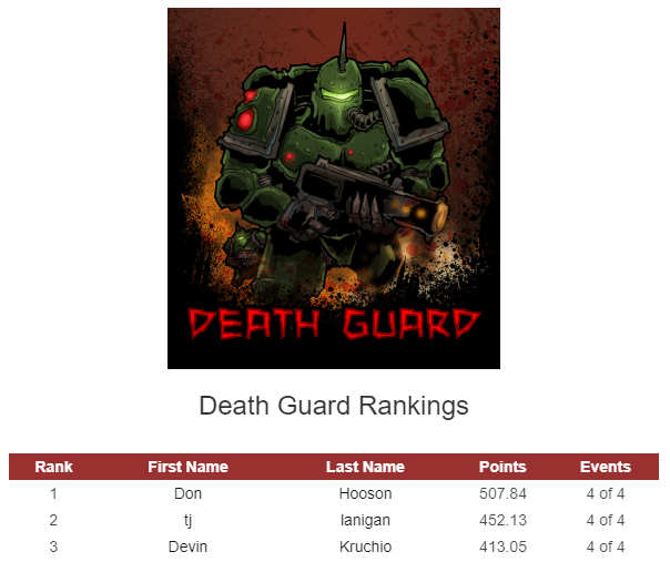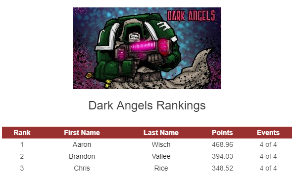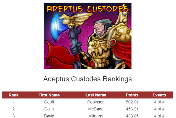 Aaron Wisch, who also performed very well at the BAO as one of the few Dark Angels players in attendance and who is an excellent DA player who is well known on the West Coast, really consolidated his lead for the best Dark Angels player thanks to the Bay Area Open. Don Hooson’s win shot him into a solid lead for Best Death Guard player. Geoff Robinson’s performances at the BAO also helped him put an even tighter hold on his faction in the race for the “best of Custodes” prize! All three won the Best of their faction prize at the Bay Area Open, perhaps foreshadowing the results that might come at the end of the season at the Las Vegas Open.