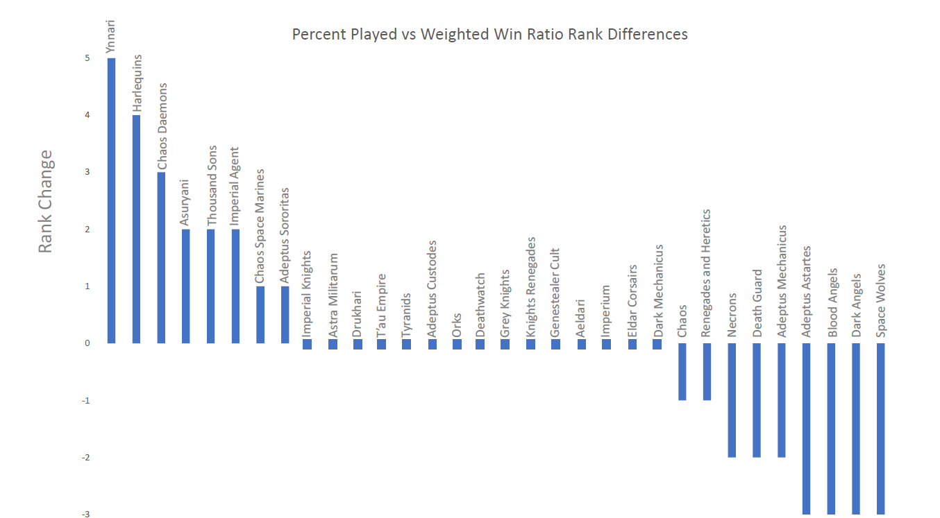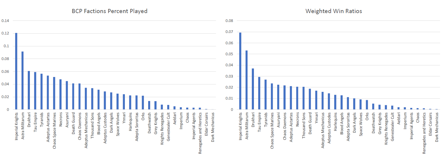 It is no surprise that Imperial Knights are a very popular faction. Given the high points cost it also isn’t surprising that they are heavily represented in the Primary Faction of players because it’s difficult to field a Super Heavy Detachment from that codex without it being your primary faction. Most interesting to me though is the power Ynnari continue to have a year into 8th edition. Their win ratio is exceptional! Dark Mechanicus and Eldar Corsairs are higher because of the very low number of players who’ve played the faction, and those players performing very well. Ynnari are well represented in the pack of armies played yet have a 70% win ratio. The proof is in the pudding when you look at the last chart, showing the percent played versus the weighted win ratio. Ynnari continue to perform extremely well. The most interesting point to me in the last chart is how Imperial Knights, though highly represented, do not have a positive representation to win ratio. In my opinion this clearly demonstrates a few points about Knights in the current competitive meta. The first is that Knights are being played a lot, but not necessarily by the best (most well performing) players. The second is that Knights are regaining their gate keeper army status from the editions of yore. While they may not be winning tons of events, they are still a well performing and prolific army that have to be prepared for. The third is they seem to perform best at smaller events where it is easier for the player to draw three favorable matchups and therefore avoid their paper to their rock. A fourth point points to Imperial Knights and Astra Militarum as being crutch lists, their high play rate but low performance in the last chart indicates to me that less skilled players may have winning records with these armies but they seldom appear to be winning out over all, or even at a rate that is more balanced to the number of players running them at events.